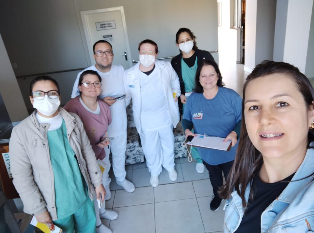 Na tarde desta terรงa-feira, 15 de julho, durante a troca de plantรฃo no Hospital Santa Lรบcia de Casca, as diretoras do SindiSaรบde, Fabiana Biondo e Maria Tedesco, realizaram uma conversa com os trabalhadores da unidade.