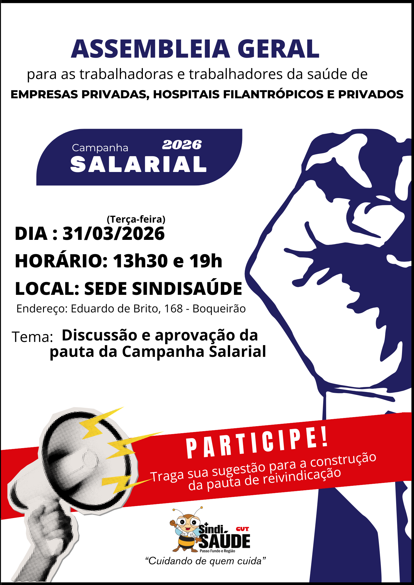 DIA: 𝟯𝟭/𝟬𝟯/𝟮𝟬𝟮𝟲 HORÁRIO: 13h30 e 19hLOCAL: Sede SindiSaúdeTema: Discussão e aprovação da pauta da Campanha Salarial