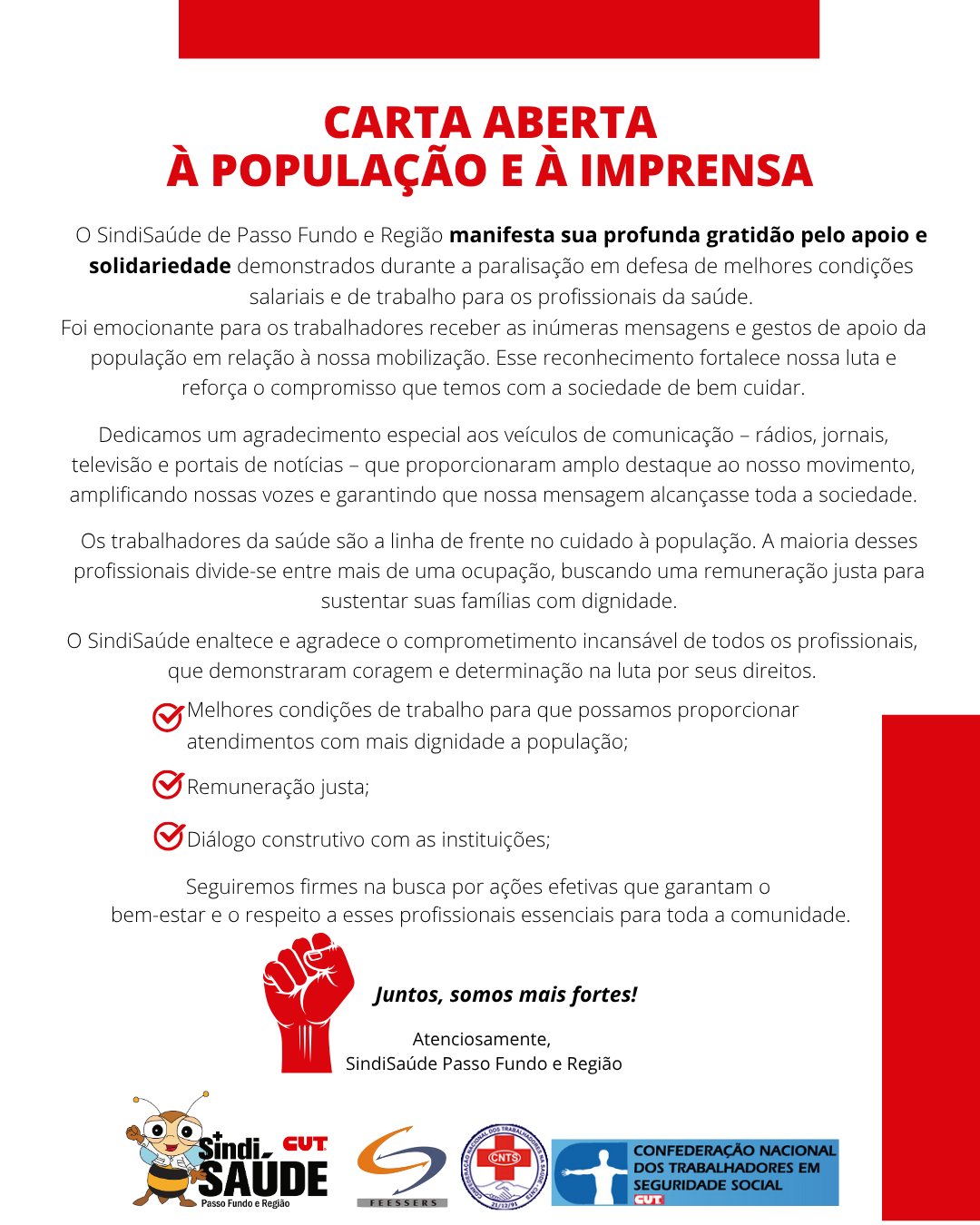 O SindiSaúde de Passo Fundo e Região manifesta sua profunda gratidão pelo apoio e solidariedade demonstrados durante a paralisação em defesa de melhores condições...